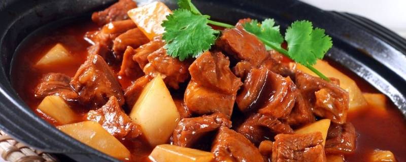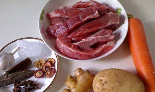 用料:牛腩450克、土豆100克、胡萝卜150克、食盐4克、食用油30毫升、生姜10克、山楂3克、八角2.5克、桂皮5克、冰糖30克、白皮蒜20克、老抽8毫升、料酒10毫升。