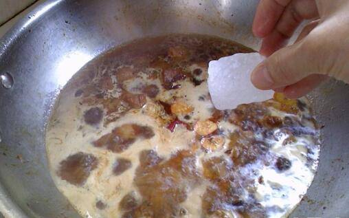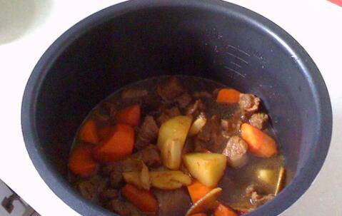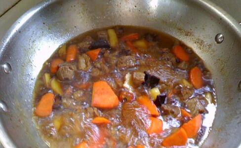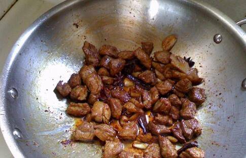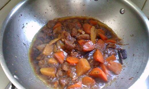 9、在高压锅压15分钟后,再把牛肉倒入出炒锅中收汁即可。