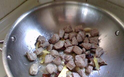 4、另锅热油,先将八角、桂皮、生姜、蒜片煸出香味,然后加入牛腩小炒片刻。