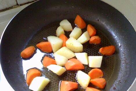 3、热锅后倒入比平时炒菜稍多一些的油,把土豆、胡萝卜块放入稍煎至表面焦黄即可。