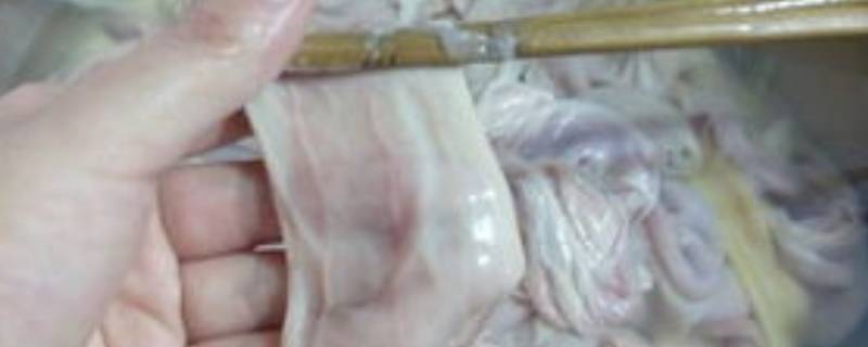 2、将小肠一端的开口往外翻一点,将翻开的一端抵住筷子。然后,顺着筷子将小肠往上套,一边套一边往筷子尾端捋,直到小肠的另一端也穿过筷子的头部。手拿着筷子抽出小肠后,顺势翻出余下的小肠。