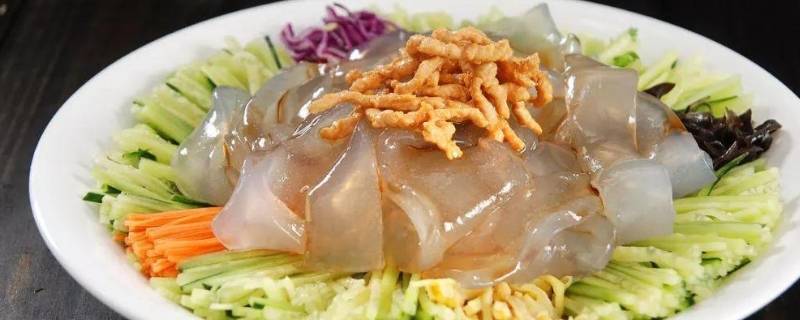 将泡好的大拉皮垫入盘中底部, 将炒好的肉丝放在上面。