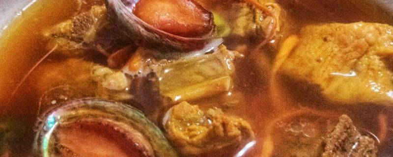 5、将准备好的排骨,鲍鱼,鲍鱼壳一起放入砂锅中,加入足够的凉水,姜大块排散,京葱两段,水大火烧开后加入适量料酒去腥。然后转小火煲一个半小时(这个期间注意要经常撇油,将汤最上面的油撇掉)。