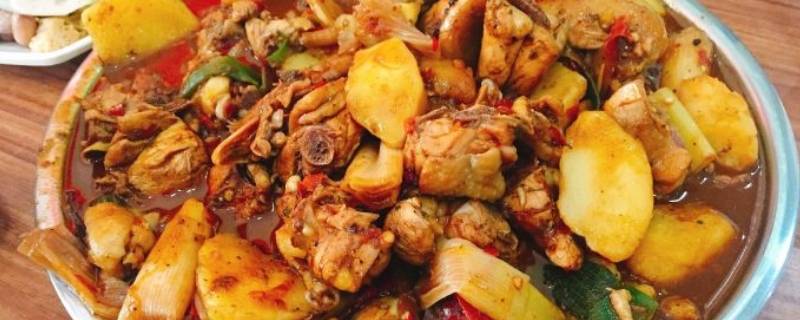 新疆大盘鸡,又名沙湾大盘鸡、辣子炒鸡,是新疆维吾尔自治区塔城地区沙湾市的特色美食,20世纪80年代起源于新疆公路边饭馆的江湖菜,主要用鸡块和土豆块炒炖而成,还同新疆皮带面搭配食用。色彩鲜艳、爽滑麻辣的鸡肉和软糯甜润的土豆,辣中有香、粗中带细,是餐桌上的佳品。