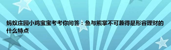 小编今天给各位玩家朋友们带来的是蚂蚁庄园小鸡宝宝考考你问答:鱼与熊掌不可兼得是形容理财的什么特点,有记得的玩家朋友吗?不记得也没有关系,小编已经帮助大家把蚂蚁庄园小鸡宝宝考考你问答:鱼与熊掌不可兼得是形容理财的什么特点找了出来,你只需要动动你的小手就可以轻松知道啦,快来瞧一瞧吧。