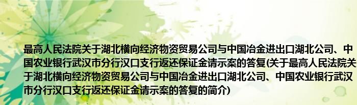 本文关于最高人民法院关于湖北横向经济物资贸易公司与中国冶金进出口湖北公司、中国农业银行武汉市分行汉口支行返还保证金请示案的答复的简介就讲解完毕,希望对大家有所帮助。