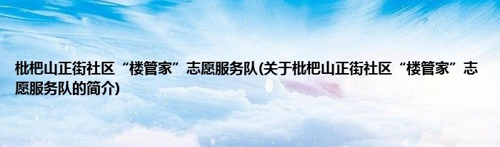 大家好,枇杷山正街社区“楼管家”志愿服务队,关于枇杷山正街社区“楼管家”志愿服务队的简介很多人还不知道,现在让我们一起来看看吧!
