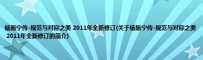 1、 《杨振宁传-规范与对称之美(2011年全新修订)》是2011年广东省出版集团图书发行有限公司(广东经济)出版的图书。