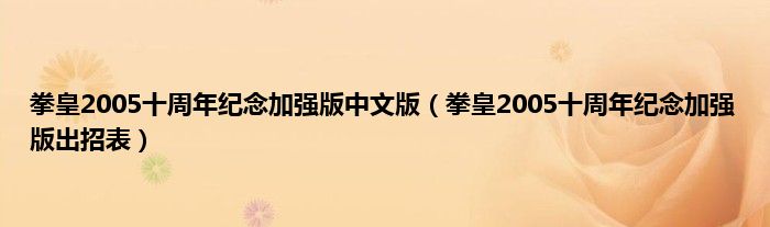 大家好,小问来为大家解答以上问题。拳皇2005十周年纪念加强版中文版,拳皇2005十周年纪念加强版出招表这个很多人还不知道,现在让我们一起来看看吧!